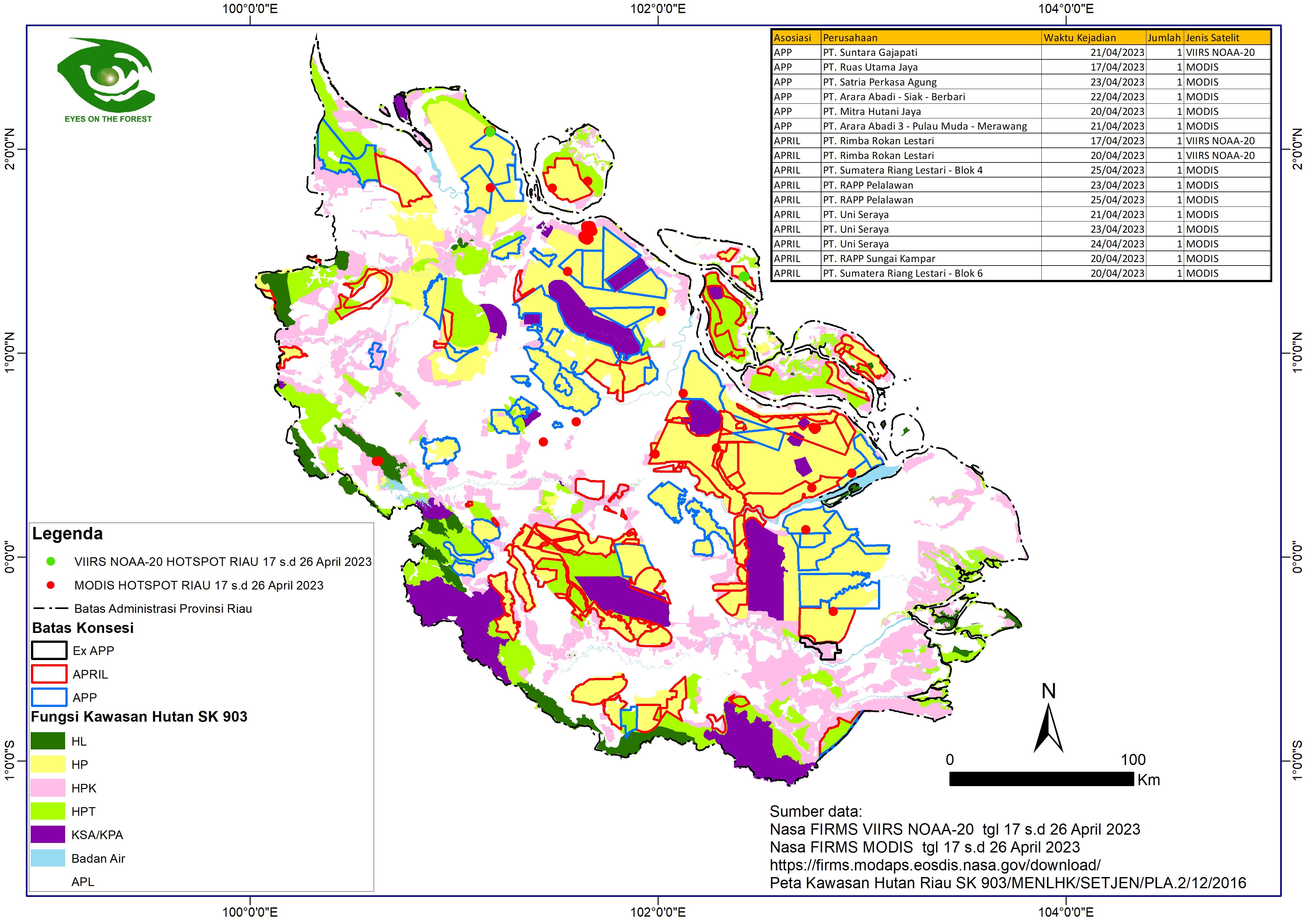 Analisis Eyes on the Forest berdasarkan hasil deteksi satelit NASA FIRM VIIRS (dengan level confidence nominal) sejak 17 hingga 26 April 2023, terdapat 1 titik panas (hotspot) di konsesi milik grup Asia Pulp & Paper / Sinar Mas Group, yakni PT Suntara Gajapati dan 2 titik panas di konsesi milik grup APRIL yakni PT Rimba Rokan Lestari.